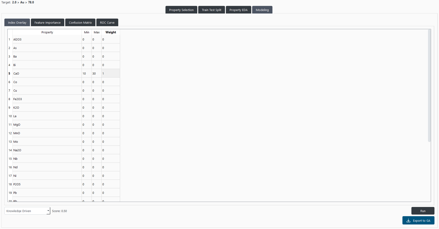 Users can select the “Knowledge Driven” option from the dropdown menu. This option enables them to establish minimum and maximum threshold values and a weight for each selected property. It allows users to construct a model based on their geological knowledge to compare it with a data-driven approach, as show in Figure 12. the index overlay operation is computed for every point with the following formula:
