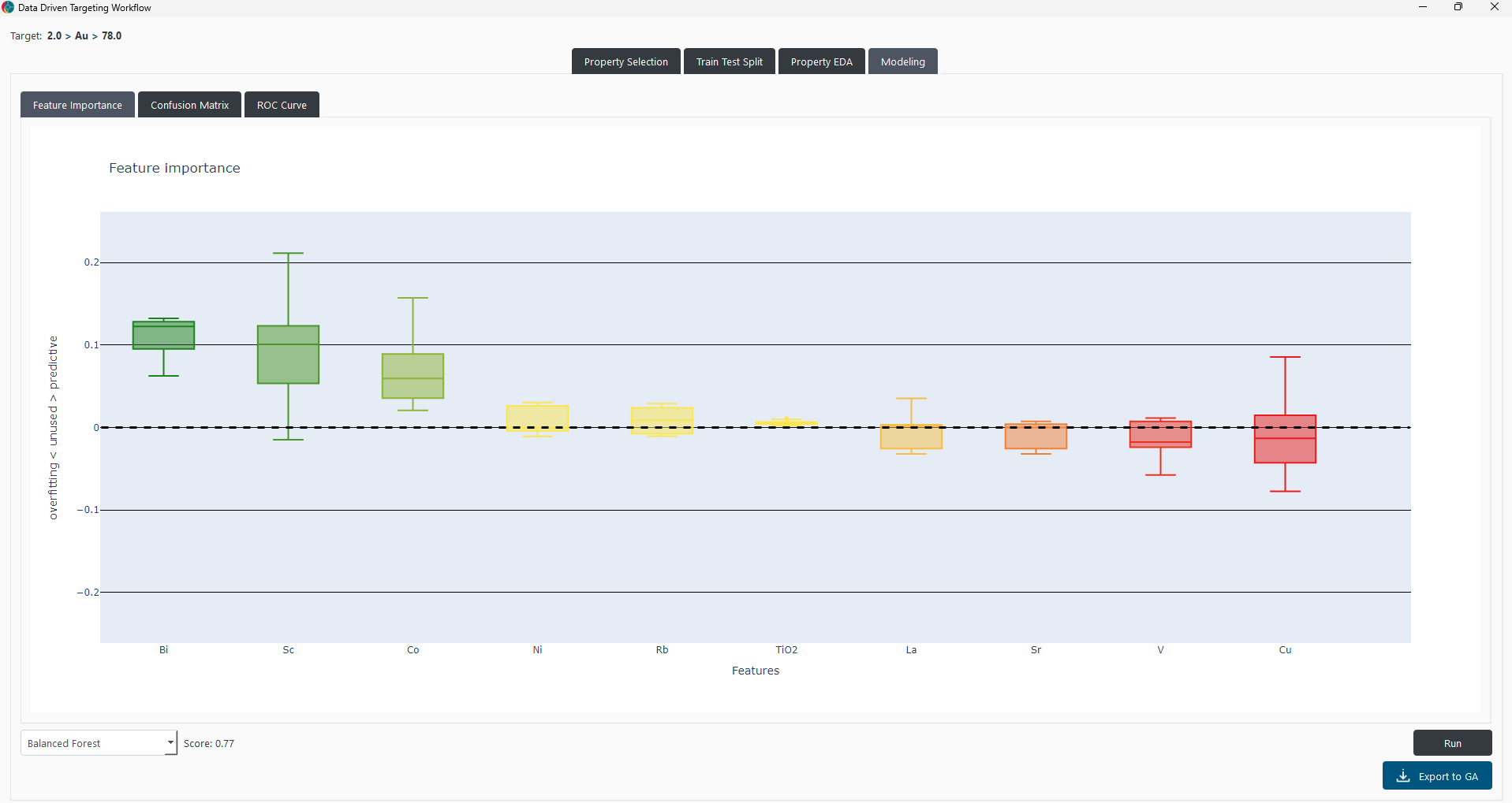 Three visualization options are also available: Feature Importance, Confusion Matrix, and ROC Curve. Users can click on the corresponding button to display the visualization. Finally, by clicking on the Export to GA button, users can export all computed results to GA.
