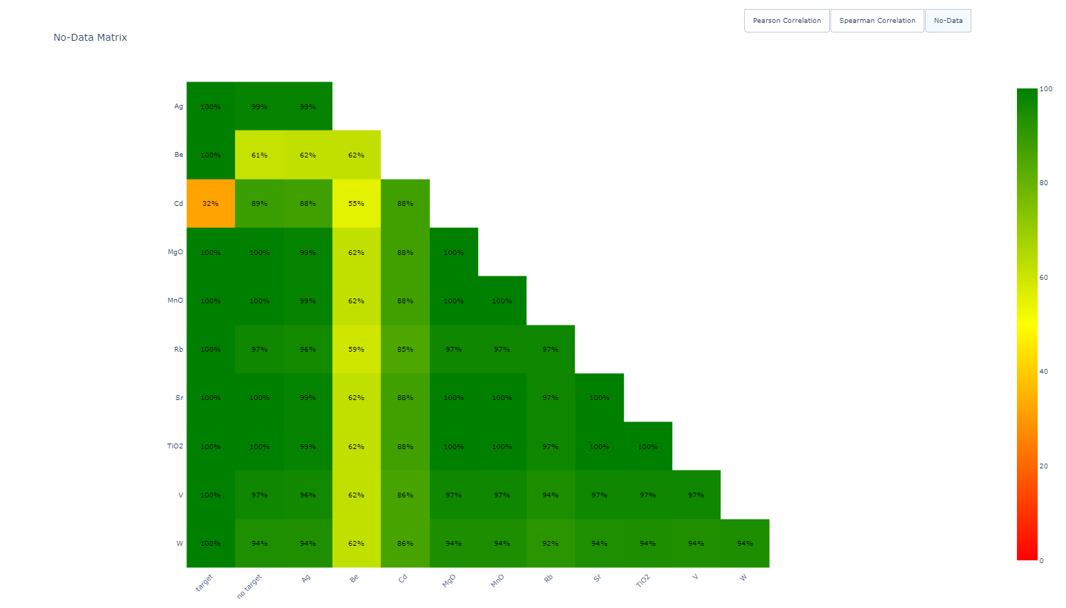 The No-Data matrix displays the percentage of missing values for each property. It allows users to quickly identify properties with high levels of missing data, which may compromise model performance. Properties with a high proportion of no-data values should be deselected to maintain dataset quality. The matrix also includes the target and non-target properties, providing insight into their respective completeness.