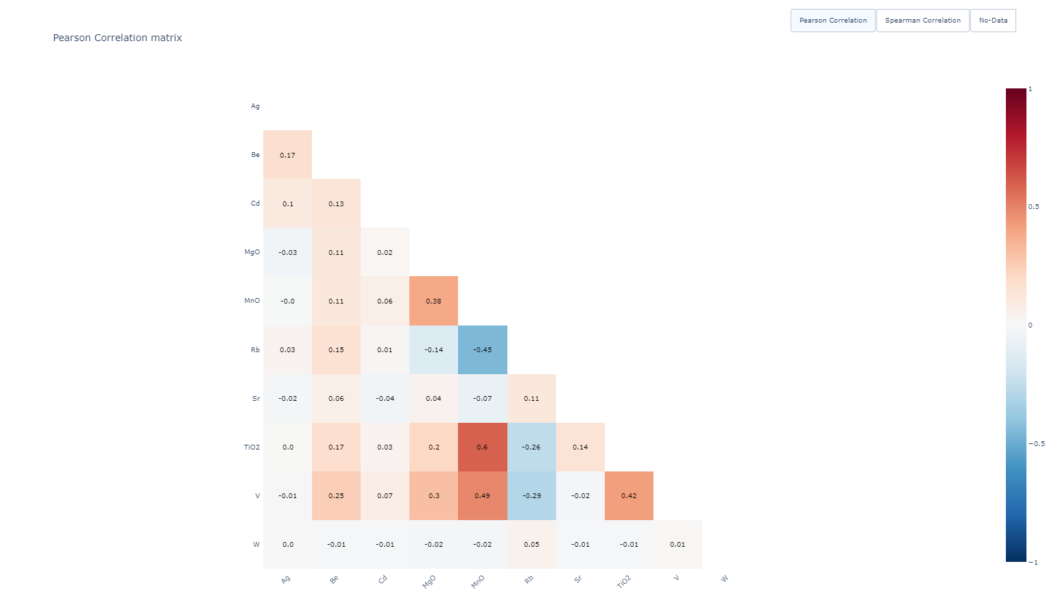 The Pearson correlation matrix shows the linear relationships between properties across the entire dataset. For any two properties, the correlation is calculated using all common data points, excluding any with missing values. A high correlation value (close to 1 or -1) indicates that the two properties carry similar information. In such cases, it is recommended to deselect one of them to avoid redundancy.