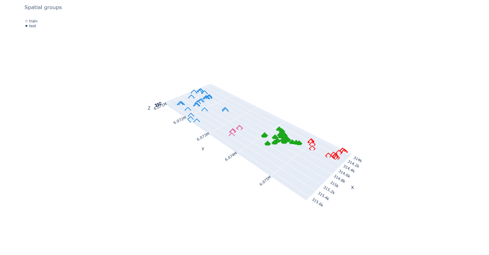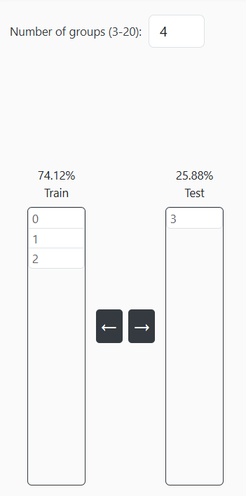 In the left section, users can select several Groups values (see Figure 10). Each created group has an identifier. In the left section, users also have the option to transfer clusters between the training and testing datasets using the provided arrows, as shown in Figure 10. The percentage of the data that will be used for testing is displayed above.